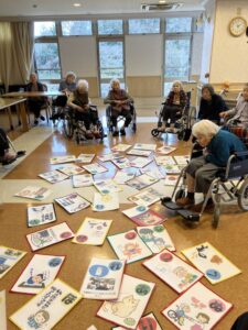 特別養護老人ホームでは、すごろくゲームやカルタ大会、福笑いなどの、なつかしい正月遊びを各フロアで行いました。