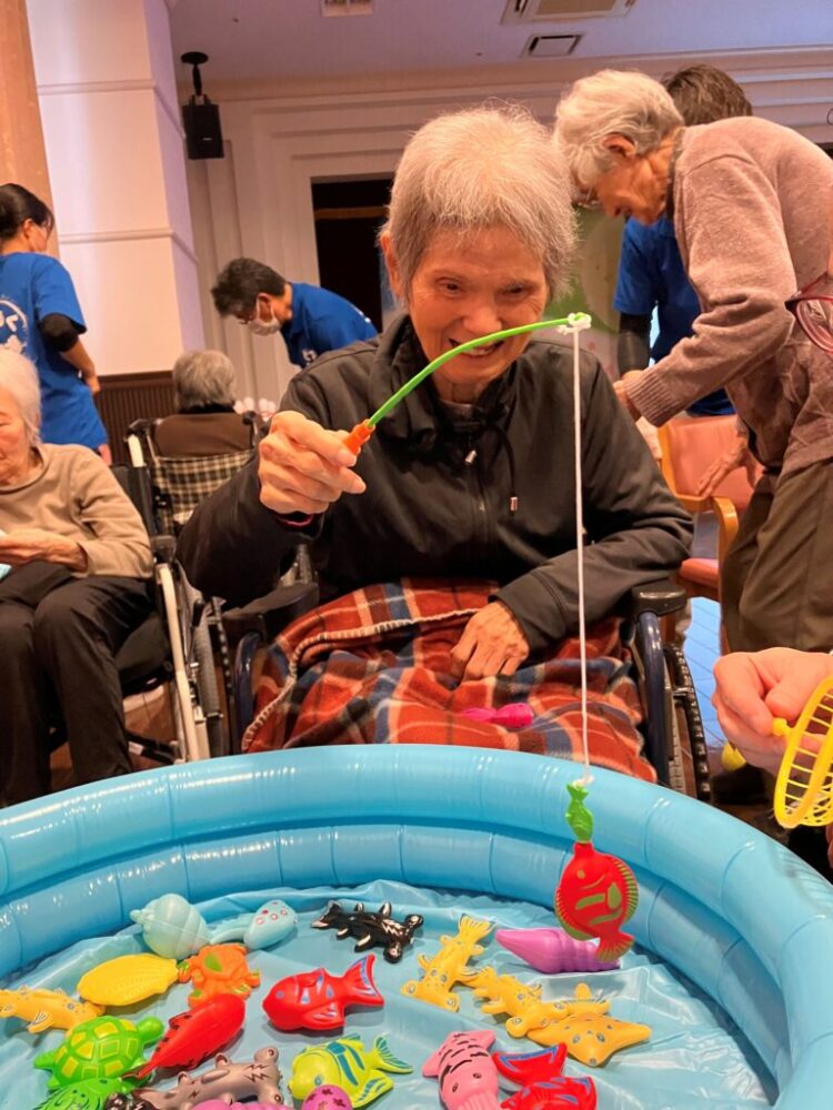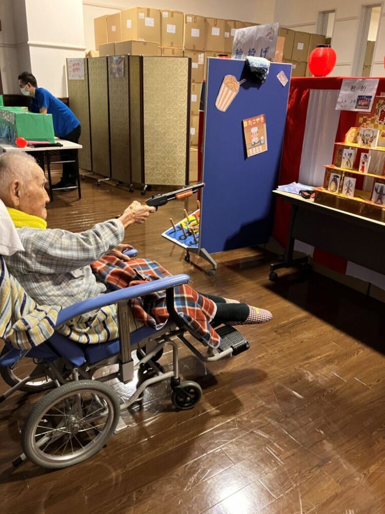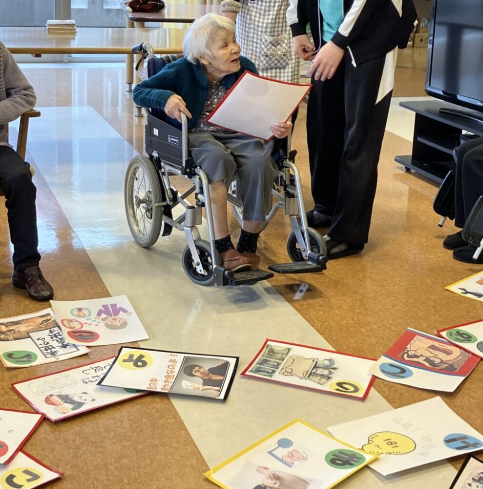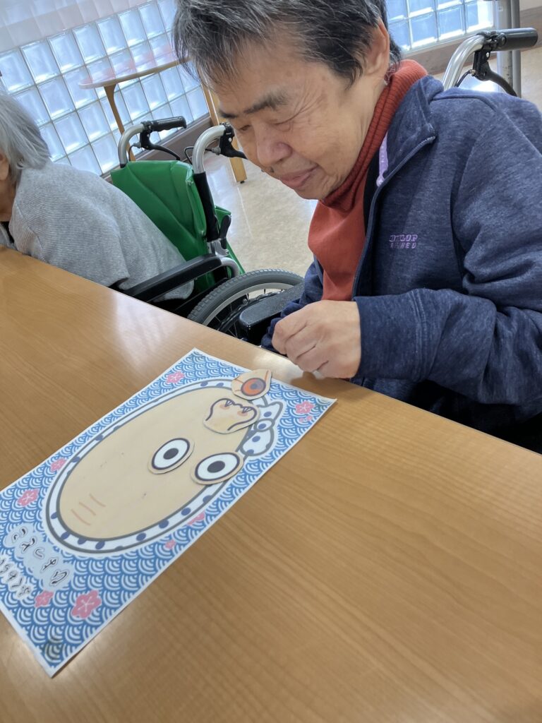 特別養護老人ホームでは、すごろくゲームやカルタ大会、福笑いなどの、なつかしい正月遊びを各フロアで行いました。